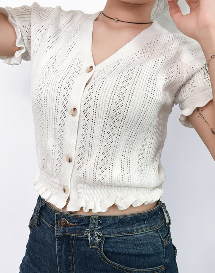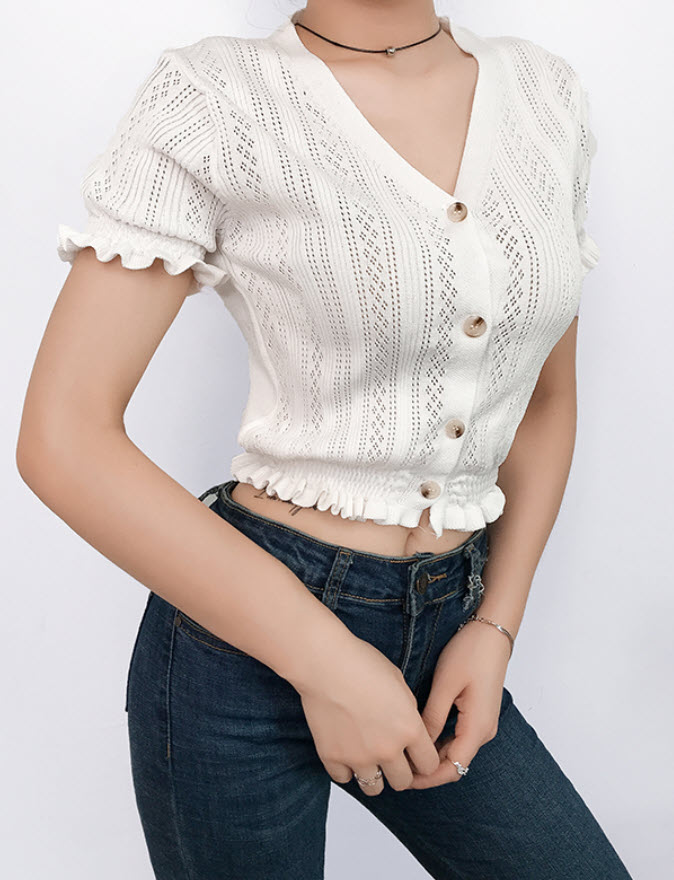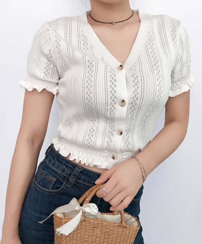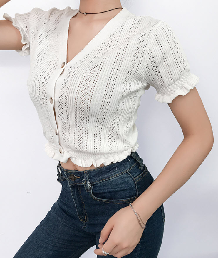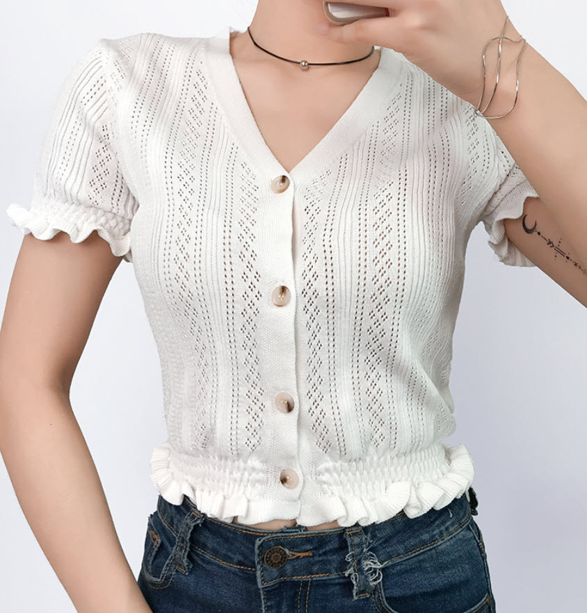 - Find similar looking product here: https://www.dev.fashionchingu.com/kpop-fashion/blackpink-fashion/white-v-neck-short-sleeves-cardigan-jennie-blackpink/